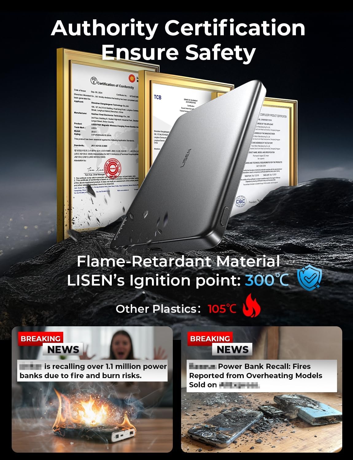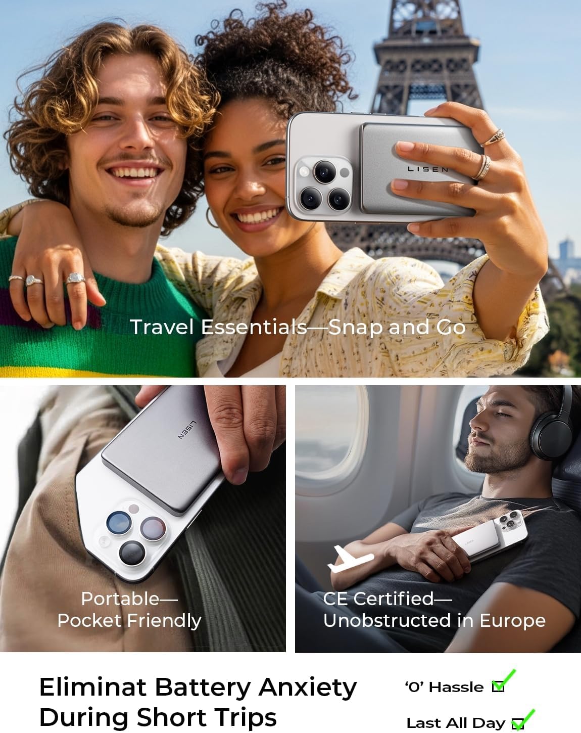 LISEN Ultra Slim MagSafe Portable Charger,5000mAh Wireless Card Slim MagSafe Battery Pack iPhone 17 Air Accessories,Magnetic Power Bank for iPhone 17 Pro Max Plus Air/16/15/14/13/12,Gifts for Men